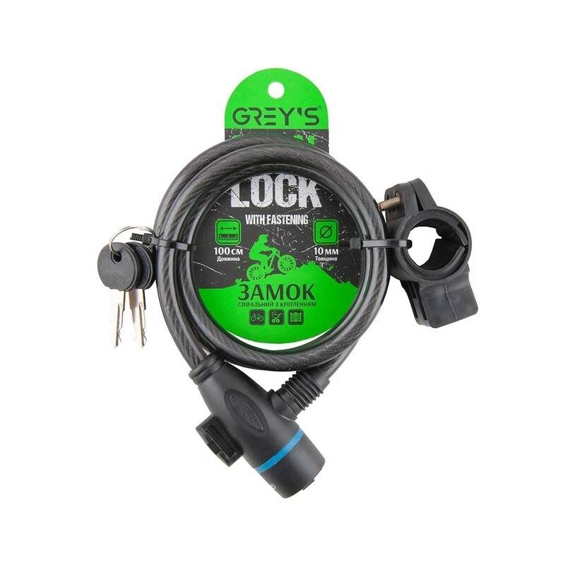Велосипедный замок 10*1000мм Grey's велозамок тросовый с 2 ключами (GR51010)